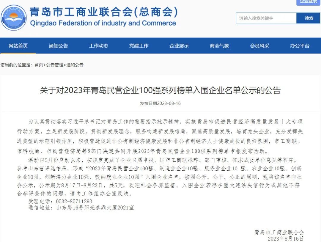 近日,2023年山東民營企業100強系列榜單發布會隆重召開,會議由山東省工商業聯合會、科學技術廳、工業和信息化廳、農業農村廳、人力資源和社會保障廳、商務廳、稅務局、市場監督管理局共同發起。經山東省工商業聯合會官網公示,銳智智能入圍2023年山東民營企業創新潛力100強!2023年青島民營企業創新潛力10強!